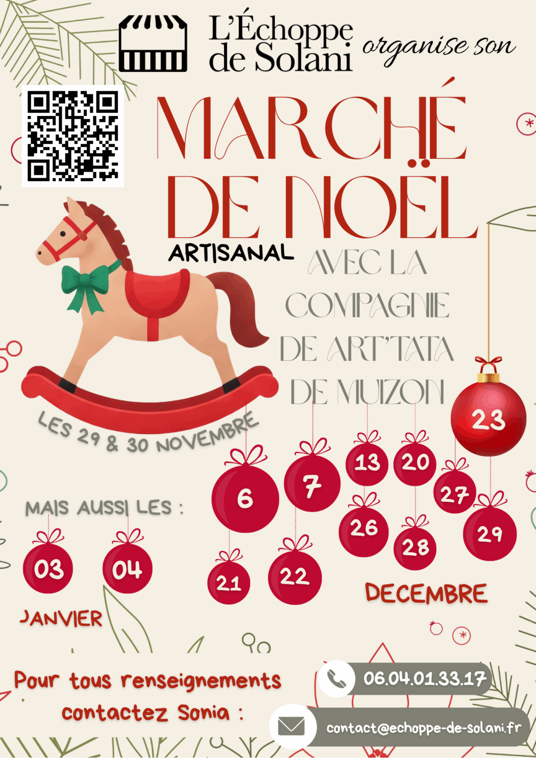 Cette année, l’Échoppe de Solani, l’ensemble de ses artisans et ses invités (différents à chaque dates de marché) vous donnent rendez-vous pour un moment chaleureux et authentique au prochain marché de Noël à Muizon, installé au pied du chapiteau d’Art’ata.